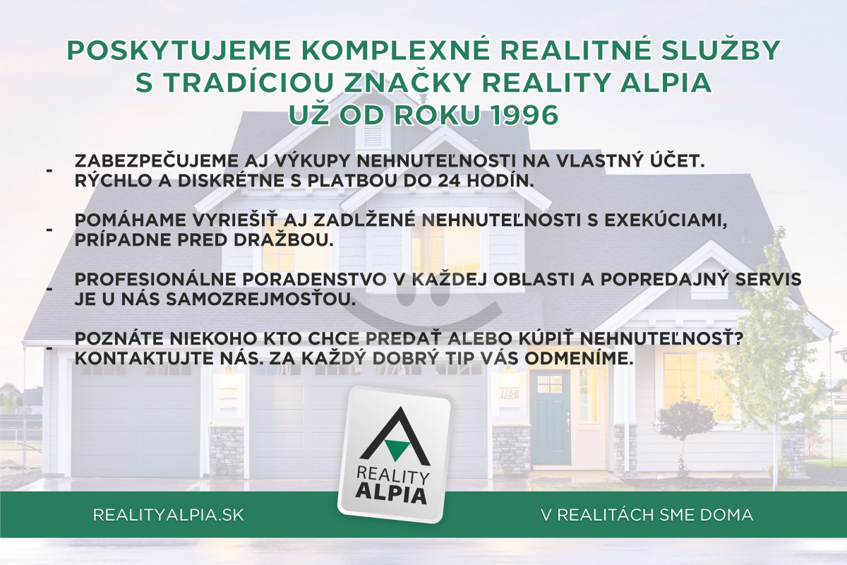 V zmysle zákona o ochrane osobných údajov dávam súhlas na spracovanie mojich osobných údajov (meno, priezvisko, titul, telefón, e-mail) v informačnom systéme prevádzkovateľa, Realitná kancelária ALPIA, za účelom vypracovania ponuky na dobu neurčitú.